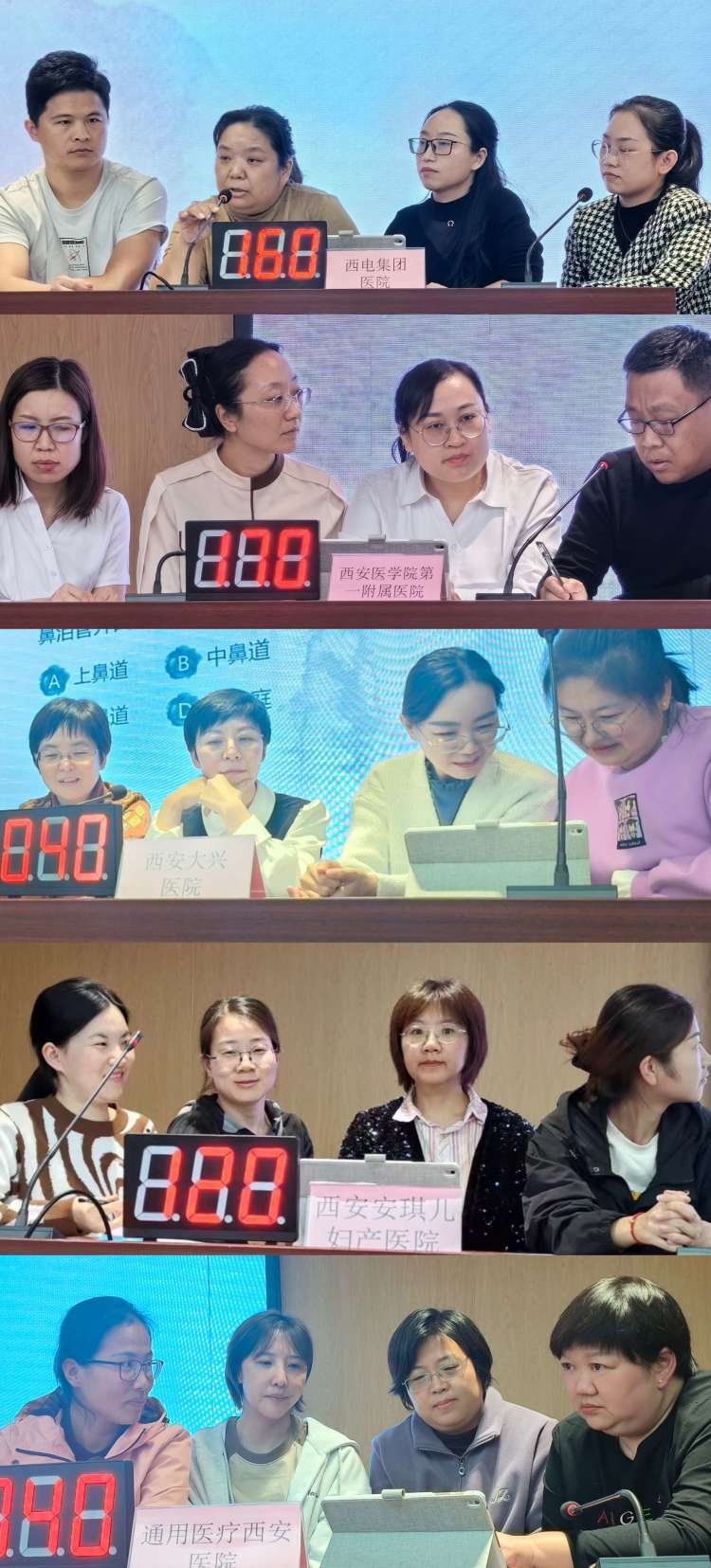 团体赛分为必答题环节、抢答题环节和风险题环节。来自西电集团医院、西安医学院第一附属医院、西安大兴医院、西安安琪儿妇产医院、通用医疗西安医院的团队进行了紧张而又激烈的比试。