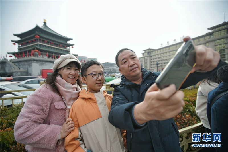外地游客在西安钟楼景区前合影留念