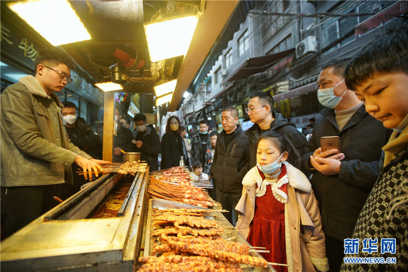 游客在西安莲湖区北院门美食风情街内购买烤肉