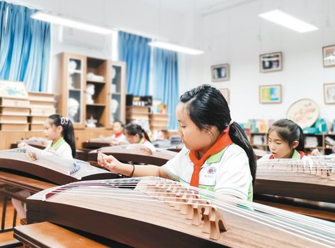 下午4点半,操场上的喧闹逐渐散去,各个社团教室里不断有声音传来。“大家注意指法,这一段在中音区,要用抹指去弹……”古筝社团活动中,音乐老师高老师带着学生一遍遍练习。隔壁的二胡社团,同学们正聚精会神地听老师讲授,一个个初学的音符跟着老师的节拍从手下流出。