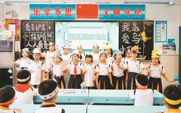 劳动路小学组织开展“同在蓝天下 人鸟共家园”主题班会,通过珍稀鸟类生存纪实影像、案例剖析、生态链科学图解等形式,向同学们讲解鸟类知识,帮助同学们深刻理解鸟类对生态平衡的基石作用,提高同学们保护鸟类、保护大自然的意识。