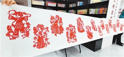 桃园路街道第一中心社区剪纸班是社区为丰富居民生活开办的兴趣班,每周一周二邀请老师开展剪纸教学。来这里学习剪纸的基本上是退休了的阿姨,大家有了空闲时间,可以重拾自己的爱好,也丰富了退休生活。半年前,剪纸班20多位阿姨商量一起合作一个作品,检验一下自己的学习效果。“平时我们都是自己练习、自己剪。只要根据自己的喜好剪就行,不用去考虑和别人配合。”剪纸班的李阿姨说,大家一起合作作品,尺寸、内容各方面就要彼此沟通商量,互相配合,这样才能保证作品的完整性。剪这幅56个民族长卷最难的就是少数民族的字,需要一一核对后才能确定,现在作品完成了很有成就感。