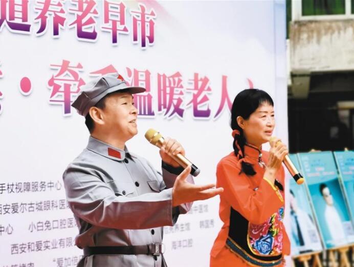 7月7日,由莲湖区民政局指导,西关街道办事处主办的“养老早市”系列活动“红色经典广场读,牵手温暖老人心”公益惠民活动在旭景名园社区广场举行,社区干部、群众欢聚一堂,通过欣赏红色文艺节目、为群众提供养老政策咨询、义诊等形式,在重温党的光辉历程的同时,让百姓在家门口享受“幸福感”。图为工作人员送演出进社区,让群众乐享文化大餐。