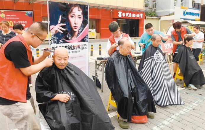 7月28日,莲湖区北关街道“养老早市”暨邻里服务集市在北稍门东社区人人乐广场拉开帷幕,15家为老服务团队和磨刀师、理发师、配锁师等志愿者一起为辖区居民们开展义诊、磨刀、配钥匙等爱心服务,让群众在家门口就能享受到便民服务。图为志愿者正在为群众理发。