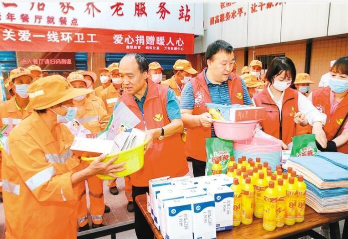 8月28日,莲湖区西关街办联合陕西蚂蚁爱心公益团队、西安市万和社会工作服务中心和爱心企业开展“关爱一线环卫工 爱心捐赠暖人心”公益慰问活动,为辖区辛勤工作的城市美容师送上装有爱心午餐券、水杯、毛巾、口罩、洗衣粉和消毒液的“爱心大礼包”,让保洁员们感受到社会大家庭的关爱。图为志愿者为保洁员发放“爱心大礼包”。