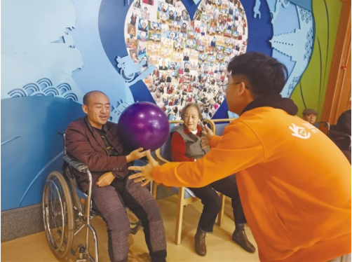 十月二十六日,西安市莲湖区养老服务中心工作人员和入住老人一起做游戏。
