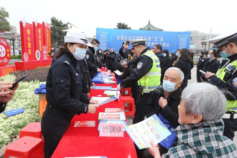 图为活动现场,交警莲湖大队民警为群众宣讲政策法规