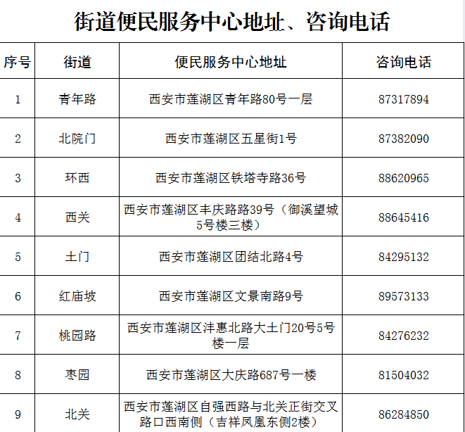 莲湖区街道社区政务服务“全区通办”第一批事项清单及各街道便民服务中心地址和咨询电话如下。