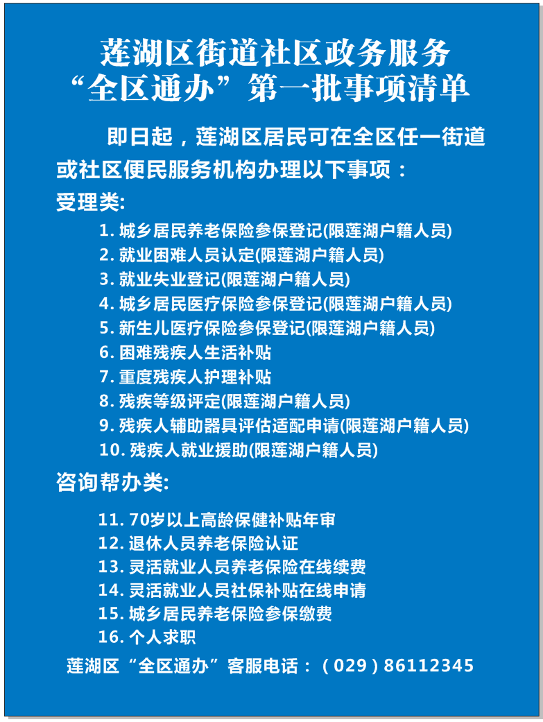 为进一步落实国务院办公厅《关于加快推进政务服务“跨省通办”的指导意见》(国办发〔2020〕35号)要求,推动跨区域通办,6月3日起,莲湖区推出街道社区政务服务事项“全区通办”。