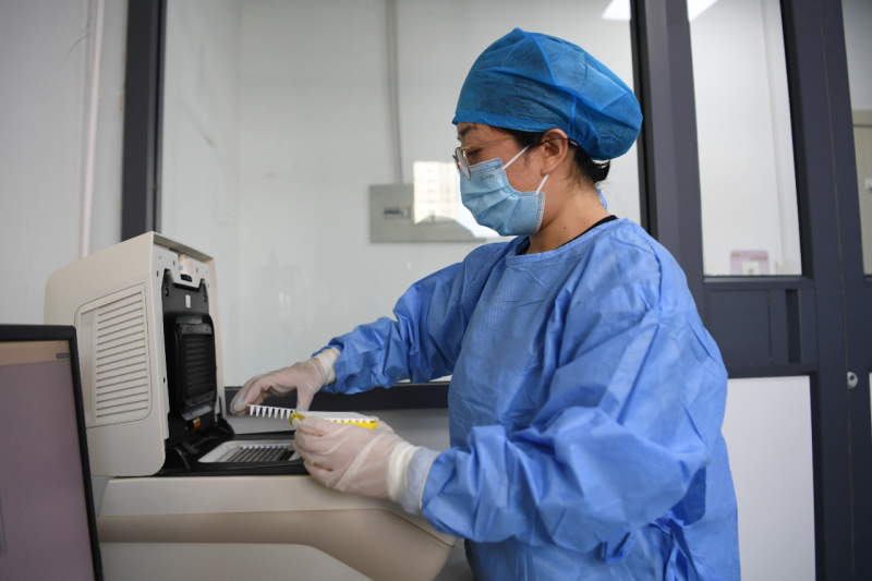 2021年10月21日,兰州大学第二医院检验医学中心副主任检验师赵有利在核酸检测实验室工作。
