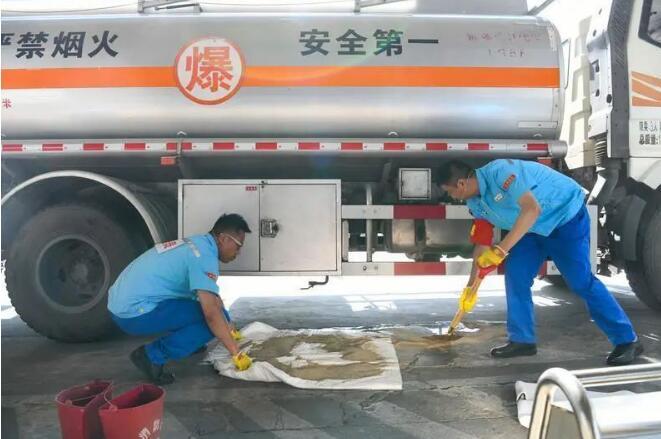 针对近期西安城区持续高温天气,容易发生易燃易爆等安全事故,本次演练模拟了“油罐车卸油作业漏油事故”和“加油车辆自燃引发火灾”两个场景。在“油罐车卸油作业漏油事故”险情现场,安全员在现场监护过程中发现油罐车卸油胶管快速接头处有油品泄漏现象,立即启动应急预案并上报信息情况。加油站员工迅速关闭油罐车阀门,排放卸油胶管内余油至储罐;同时,切断油站总电源,使用消防沙对油品设置简易围堰,防止泄漏油品扩散;消防应急救援队和医护人员分工协作,全力救助伤员,每个环节紧密衔接,整个过程持续了不到10分钟,加油站“漏油事故”得到了妥善处置。