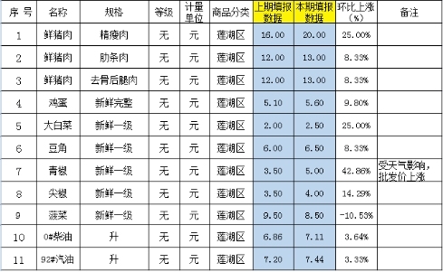 精瘦肉20元/500克上涨25%,肋条肉13元/500克上涨8.33%,去骨后腿肉13元/500克上涨8.33%,鸡蛋5.6元/500克上涨9.8%,大白菜2.5元/500克上涨25%,豆角6.5元/500克上涨8.33%,青椒5元/500克上涨42.86%,尖椒4元/500克上涨14.29%,0号柴油7.11元/升上涨3.64%,92号汽油7.44元/升上涨3.33%,菠菜8.5元/500克下降-10.53%。
