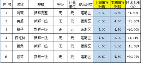 西红柿5元/500克上涨11.11%,鸡蛋5.5元/500克下降-1.79%,黄瓜4.5元/500克下降-25%,茄子4.5元/500克下降-10%,豆角5.5元/500克下降-15.38%,菠菜4.5元/500克下降-30.77%。