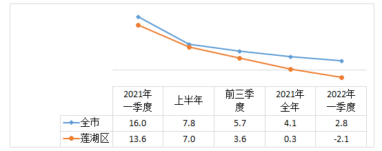 图1 2021年-2022年一季度莲湖区地区生产总值增速对比