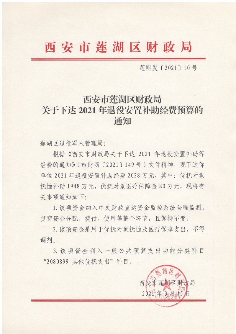 关于下达2021年退役安置补助经费预算的通知
