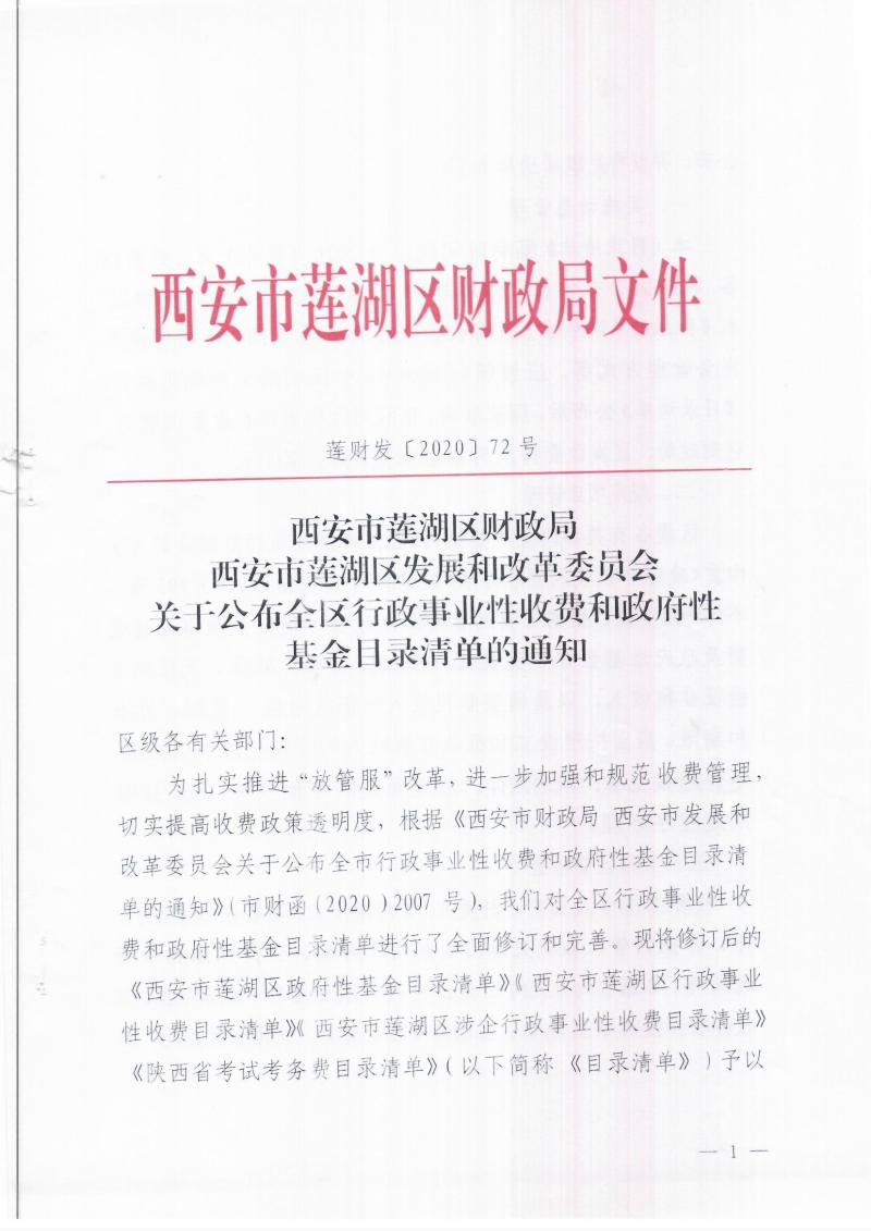 西安市莲湖区财政局西安市莲湖区发展和改革委员会关于公布全区行政事业性收费和政府性基金目录清单的通知