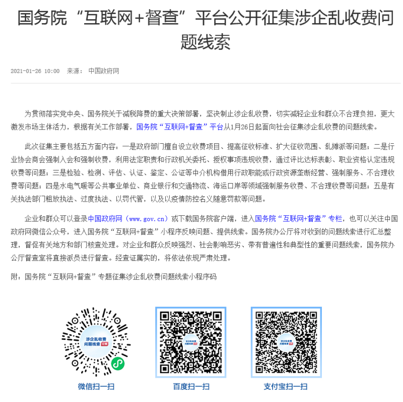 国务院“互联网+督查”平台公开征集涉企乱收费问题线索
