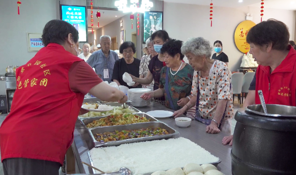 7月20日,莲湖区宫园壹号社区日间照料中心莲心餐厅外,杂粮馒头、奶香玉米饼、少油烙菜盒子等餐食陆续摆上桌,附近社区的老人们排队打饭。
