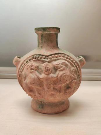 釉陶胡人戏双狮纹扁壶