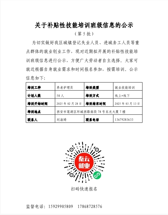 莲湖区人力资源和社会保障局公示补贴性技能培训班级信息(第5批)