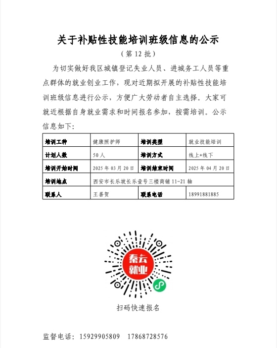 莲湖区人力资源和社会保障局对第12批补贴性技能培训班级信息进行公示。