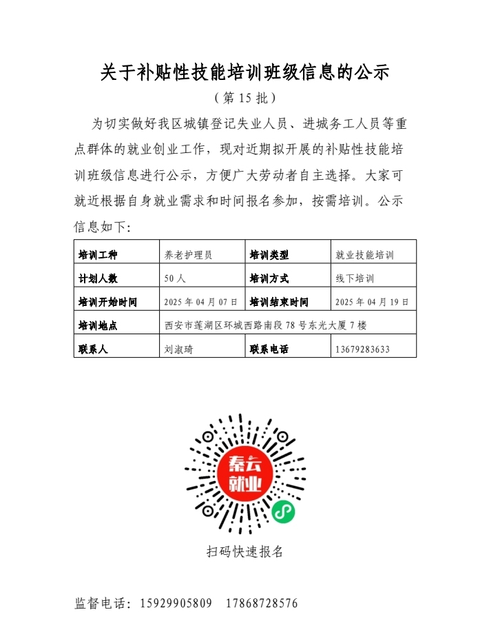 莲湖区人力资源和社会保障局公示第15批补贴性技能培训班级信息