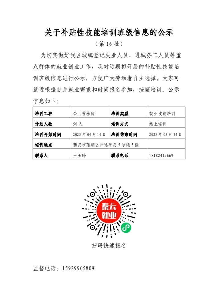 莲湖区人力资源和社会保障局关于补贴性技能培训班级信息的公示(第16批)