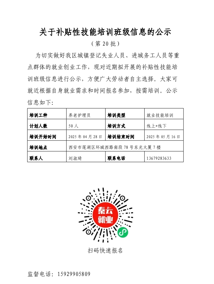 莲湖区人力资源和社会保障局公示第20批补贴性技能培训班级信息