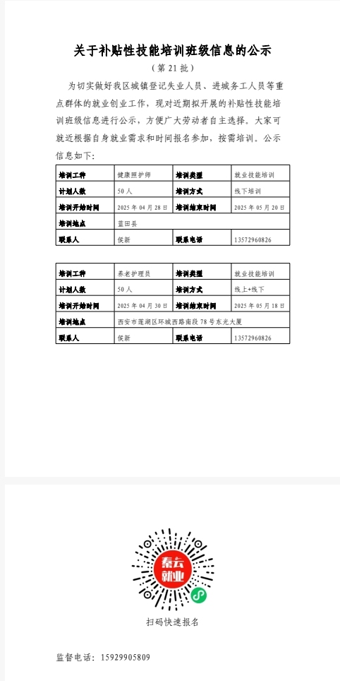 莲湖区人力资源和社会保障局对补贴性技能培训班级信息(第21批)进行公示