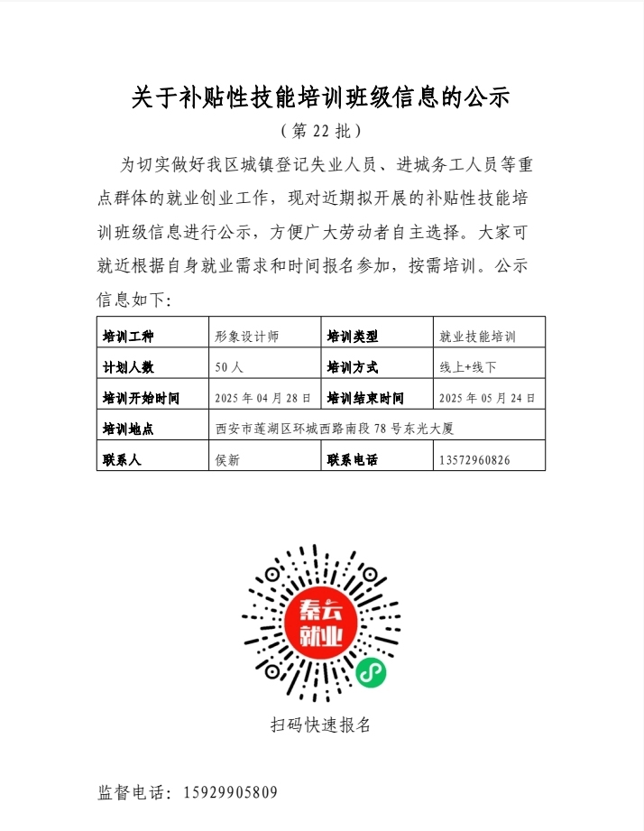 莲湖区人力资源和社会保障局关于补贴性技能培训班级信息的公示(第22批)
