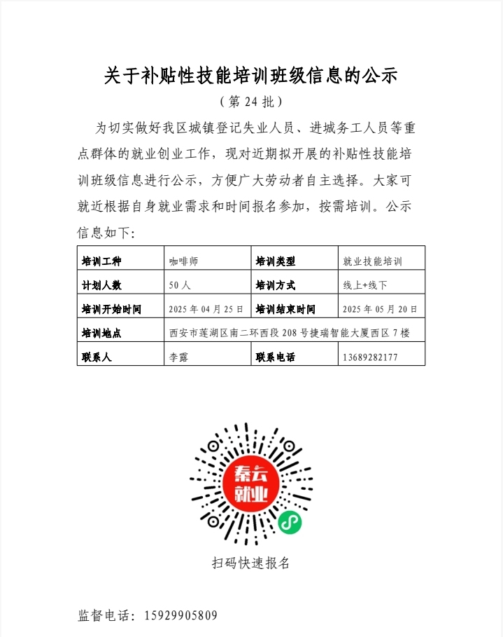 莲湖区人力资源和社会保障局公示第24批补贴性技能培训班级信息