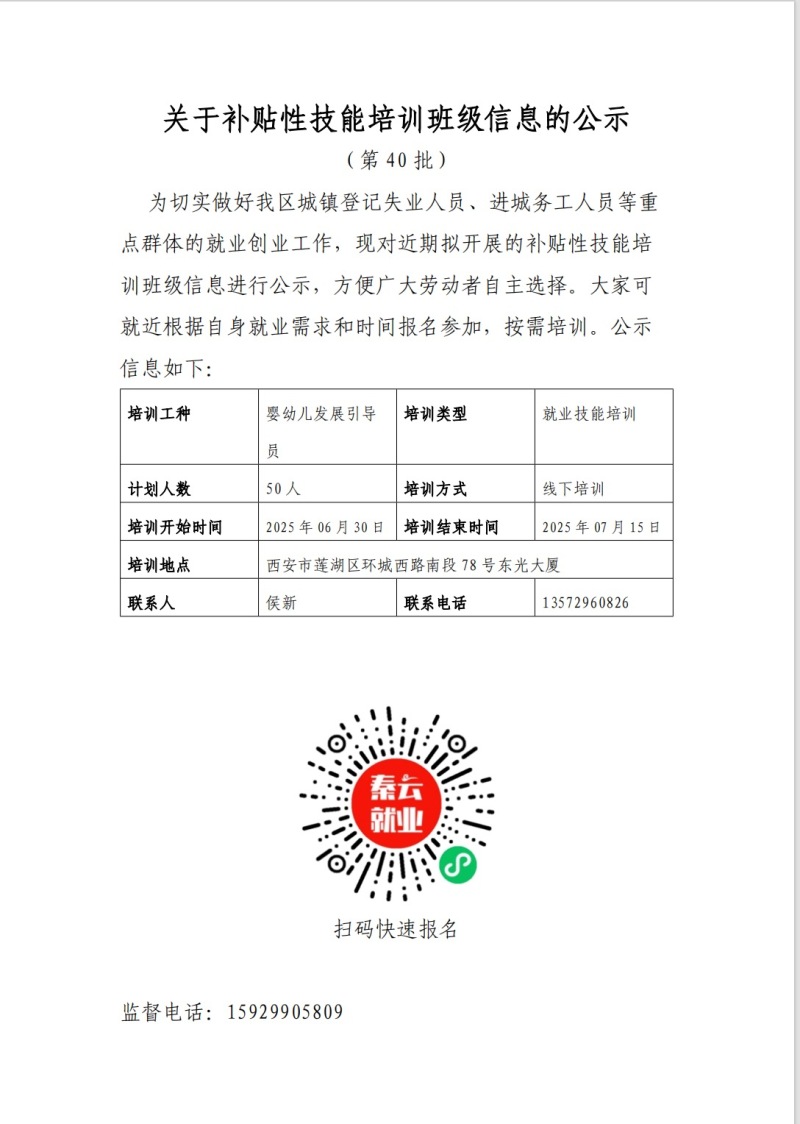 莲湖区人力资源和社会保障局公示第40批补贴性技能培训班级信息