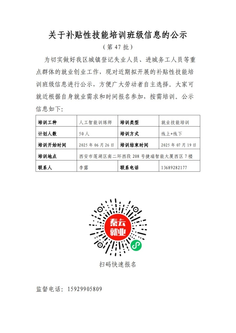 莲湖区人力资源和社会保障局公示第47批补贴性技能培训班级信息
