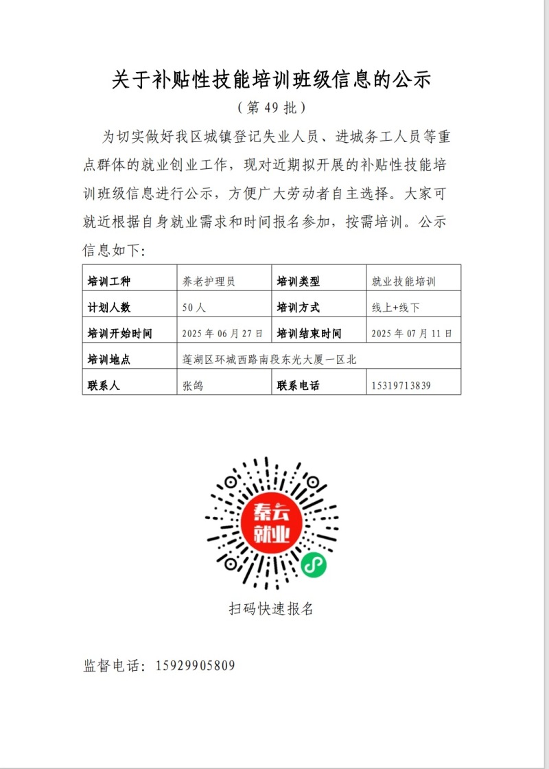 莲湖区人力资源和社会保障局公示第49批补贴性技能培训班级信息。