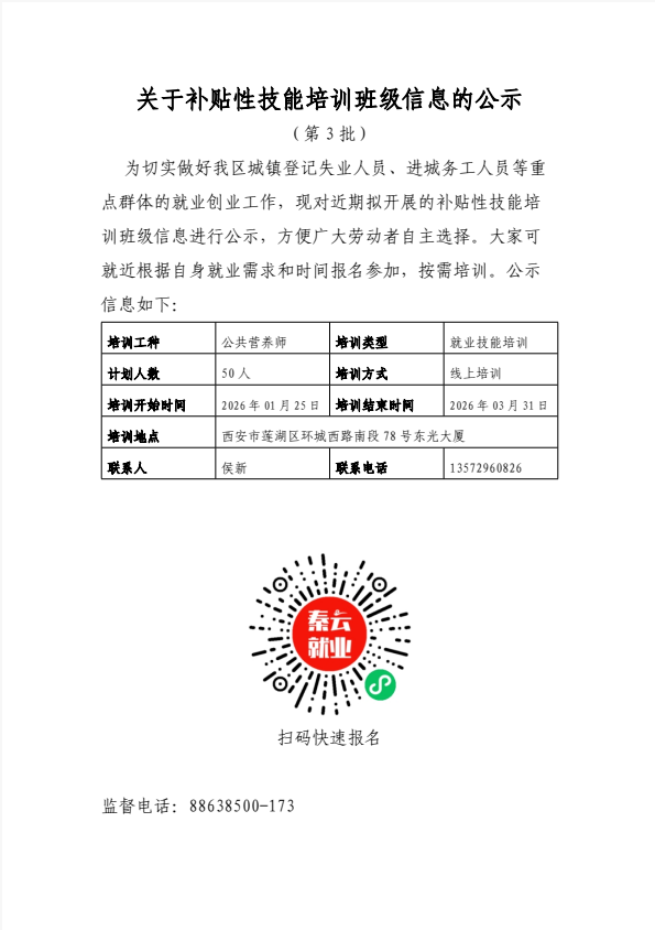 莲湖区人力资源和社会保障局对补贴性技能培训班级信息(第3批)进行公示。