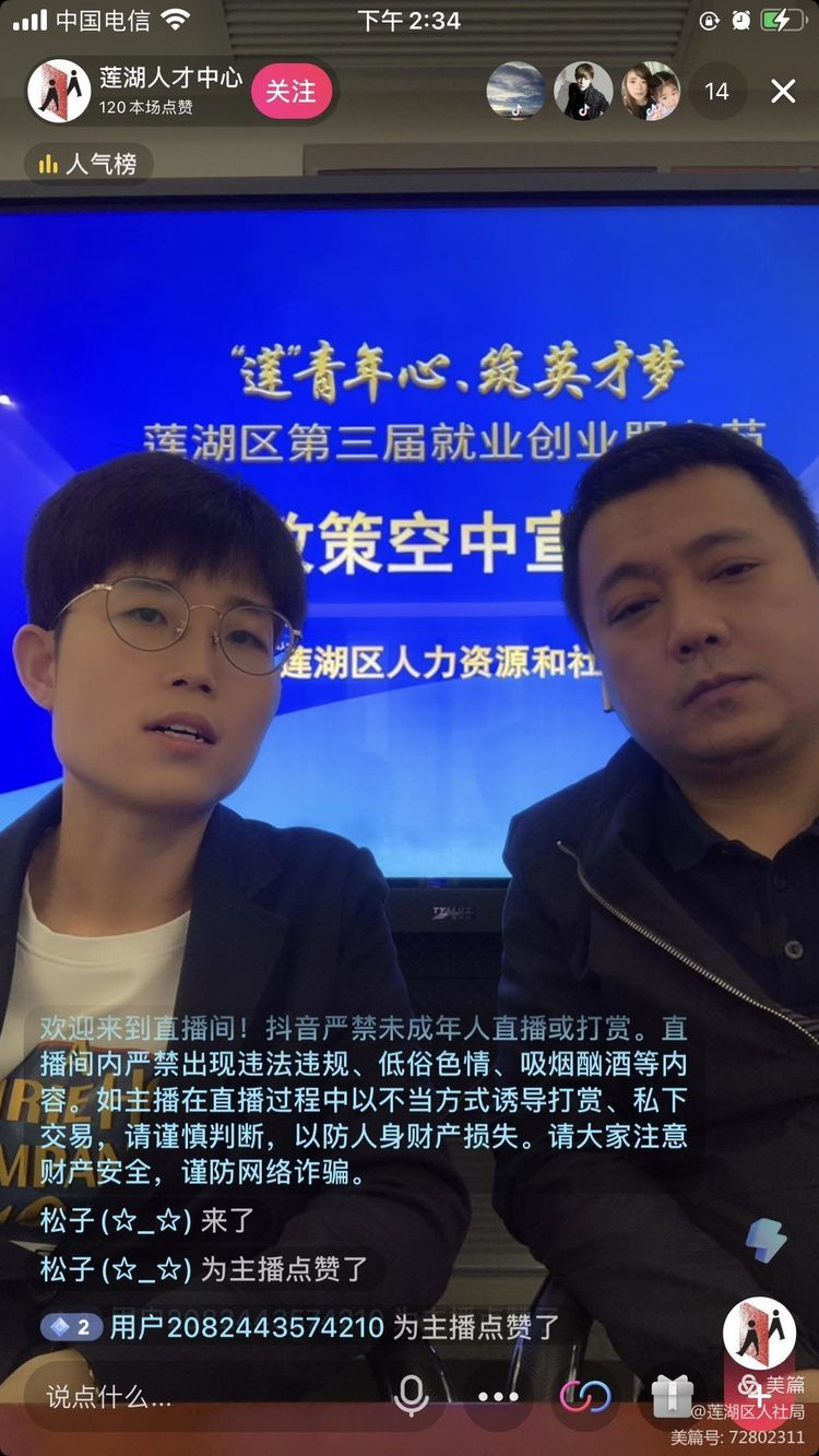 为进一步优化营商环境,扎实做好我区就业创业工作,加强青年人才队伍建设,为广大毕业生提供便捷服务,打造服务创新平台,2021年11月5日下午,莲湖区人社局承“莲湖区第三届就业创业服务节”的活动热潮,组织开展“创业政策空中宣讲课堂”活动,通过“悦享莲湖”公众号及“莲湖区人才中心抖音号”直播间为广大毕业生提供创业指导及政策支持,有效的帮助毕业生实现创业梦想,提升社会价值。