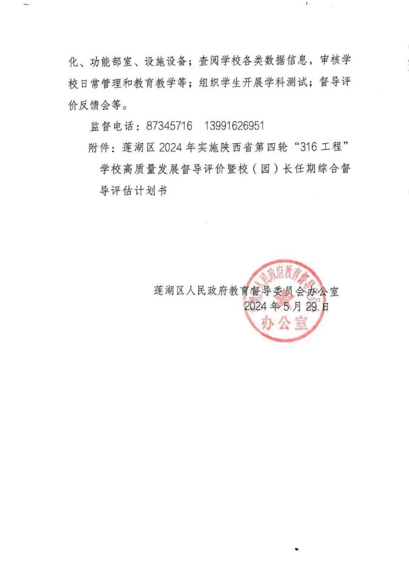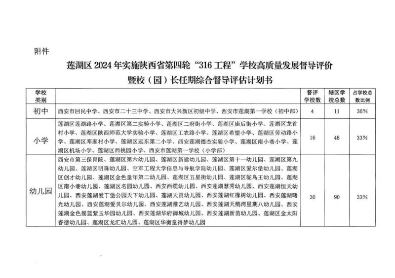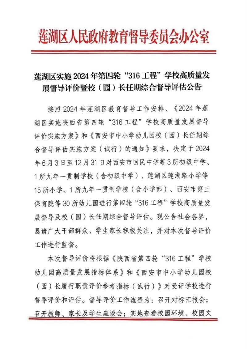 莲湖区实施2024年第四轮“316工程”学校高质量发展督导评价与校(园)长任期综合督导评估的公告。