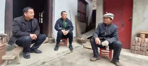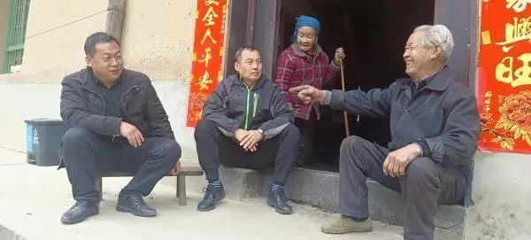 莲湖区纪委派驻周至县王家河镇东涧沟村第一书记刘有运(左二)和支部书记汤振华(左一)在老党员黄正玉家中走访。