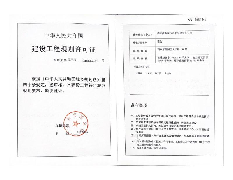 兹有西安西电高压开关有限责任公司宿舍项目,位于大庆路以南,桃园西路以北,丰登北路以西,西二环以东。该项目于2017年1月5日取得规划审批总平面图(西规大兴建〔2016〕23号),于2017年1月5日取得《建设工程规划许可证》(西规大兴建字第〔2017〕01号),规划总建筑面积53052平方米,其中地上建筑面积40890平方米,地下建筑面积12162平方米。