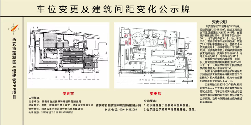 西安莲湖区“三馆建设”PPP项目,总建筑面积29361.99㎡,建设工程规划许可证:西规莲建字第〔2019〕18号。在项目开发建设过程中,原审批车位共计400个,地下机动车位341个,地上车位59个。现由于地下车位布局优化,取消了25个不利于使用的车位。现将25个车位变更到地上,与原审批 地上车位统一布局。 主要新增车位分布锅炉房西侧及食堂南侧地面。变更后总车位400个,地上车位为84个,地下车位为316个。