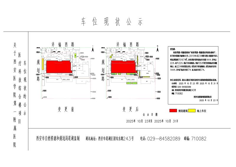 在项目建设中原审批机动车车位数144个,其中地上22个,地下122个。现由于车位局部优化,将地下35个不利于使用的机动车位调整到地上。地上22个车位位置发生变化,变更后位于项目南侧地块。变更后机动车总车位144个,其中地下机动车车位87个,地上机动车车位57个。如对上述内容有异议,请在公示期内以书面形式向西安市自然资源和规划局莲湖分局反映。